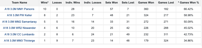 Befitting a match of 3.0 titans, the match was immediately on edge, as Med Mutual's Tyler, one of the top singles players on the west side, took out La Tuchie's Jacob, one of the top singles players on the east side. Lucas, then, at 2nd Singles, took out Eric, he of National Qualifier pedigree! Making these split wins all the more impressive is that ZERO GAMES separated the two clubs after two matches despite 36 games being played! WOWSERS!
